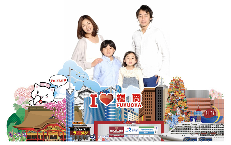 太宰府天満宮や天神、福岡タワーといった福岡の観光名所を描いたカットアウトです。グループで撮影できるように設定されています。クルーズ船の側の施設に置かれています。