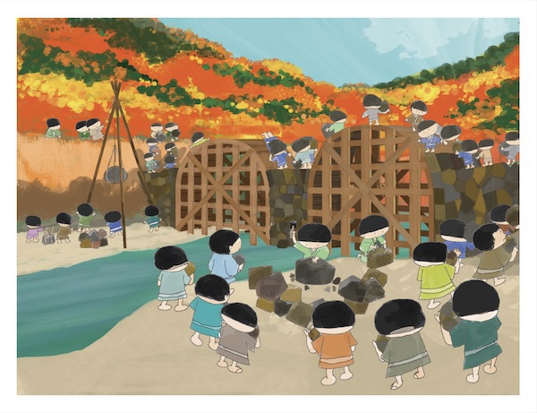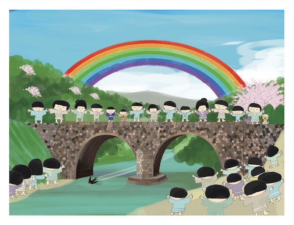 紫川の上流に位置する「春吉橋」が造られた由来を紹介する紙芝居です。100年近く前に春吉橋は石造りの眼鏡橋で、建築美も評価されていますが、事故をきっかけに地域の人たちが協力して建設したのだそうです。語り手はその中心人物の子孫である川上カツヱさん。