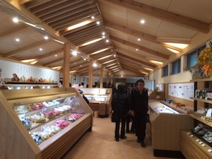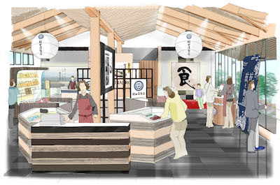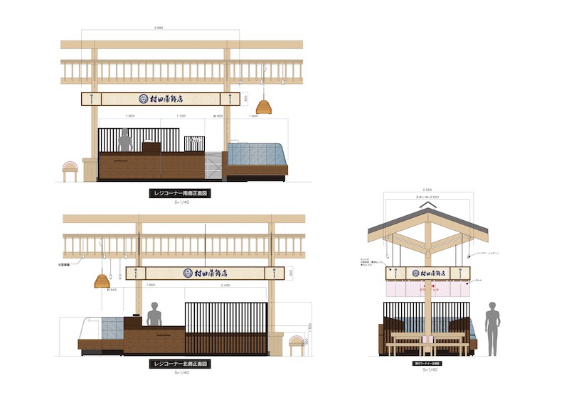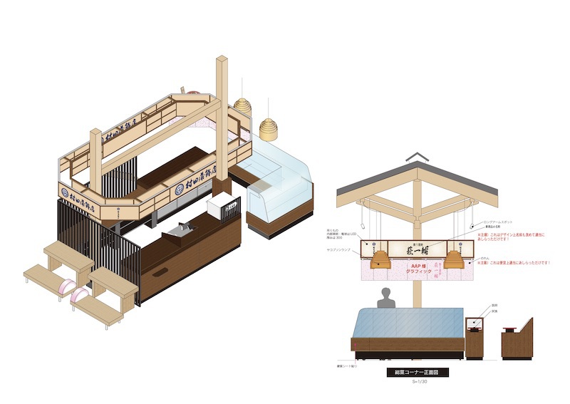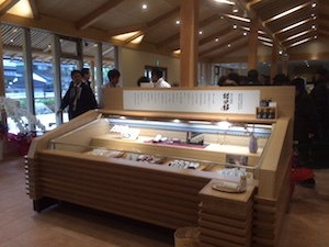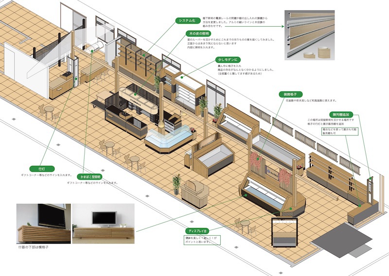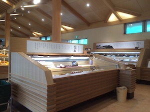 萩のかまぼこで特に有名な村田かまぼこさんの新築工事における内装デザインです。本来内装デザインはしないのですが、ある意味店舗什器のデザインとレイアウトだけでしたので問題なくできました。