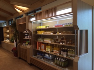 地元の設計事務所さんがデザインされた白木をふんだんに使ったこの新築店舗はすごくおしゃれで、それに合わせた什器デザインも大変でした。また、冷蔵ケースが大きいのでそのカバーリングでは構造的な工夫も必要でした。