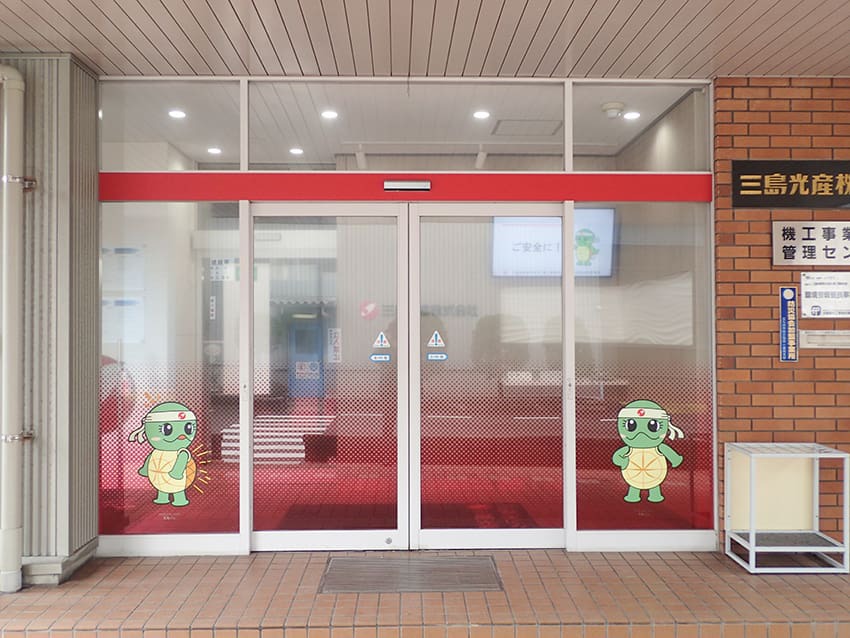 コーポレートカラーの赤色ボーダーを使った自動ドアのデザイン