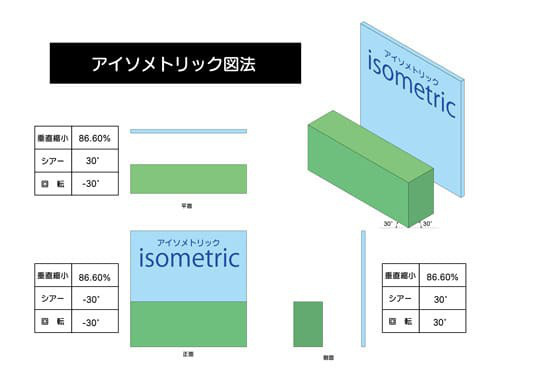 | アイソメトリック | 平面 | 86.602% | 30° | −30° |