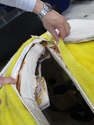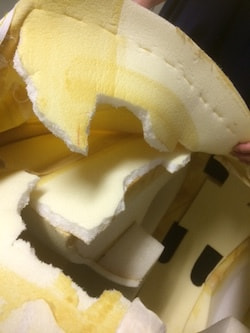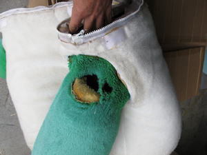 使用回数や保管方法により異なりますが、長年使用された着ぐるみは、劣化する宿命にあります。特にボア生地の汚れや、擦れ、剥げが顕著になっていきます。また、構造材であるウレタンも劣化すると粉状のものがふき出てくるようになります。