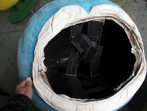 おそらく、頭部に向かって膨らんでいるめいすいくんのフォルムと翼に起因しているのかもしれません。着ぐるみ全体の重さが上の方に偏っています。そして、その重さを一点をで支えているのが肩ベルトでした。